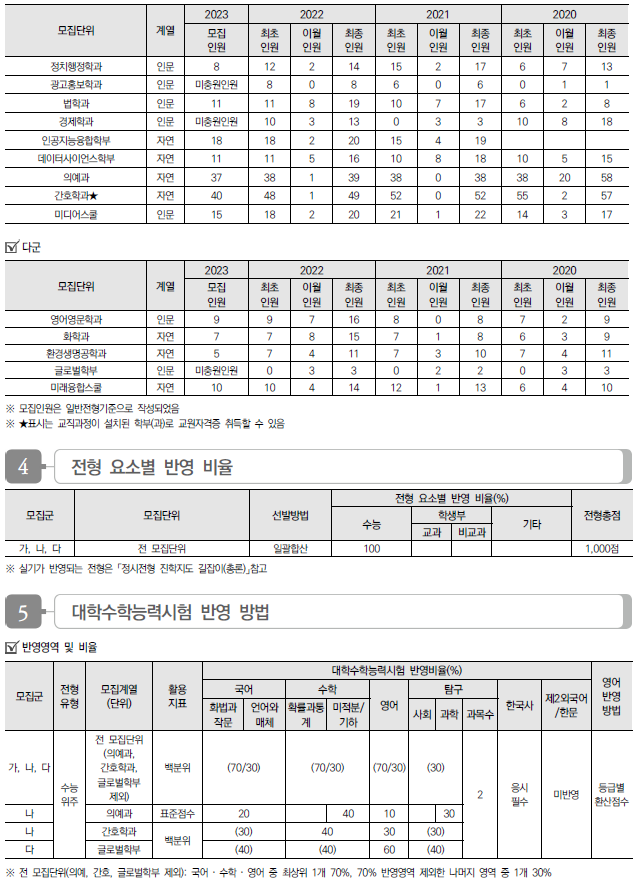2023학년도 협성대, 호서대, 화성의과학대, 강릉원주대, 강원대(춘천) 정시 모집요강 및 입시결과(커트라인)