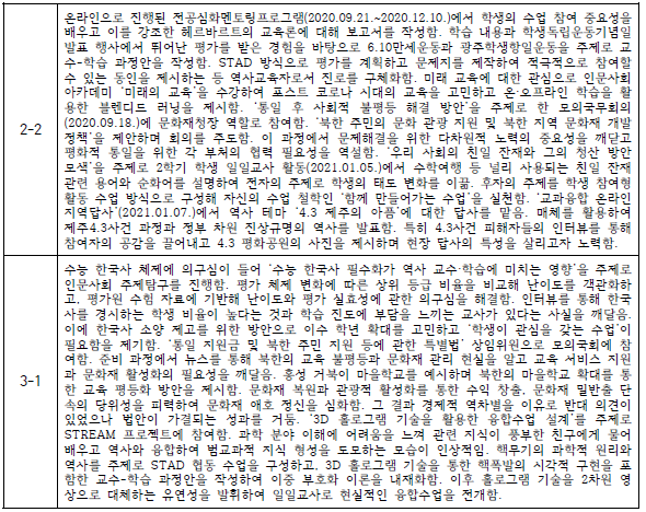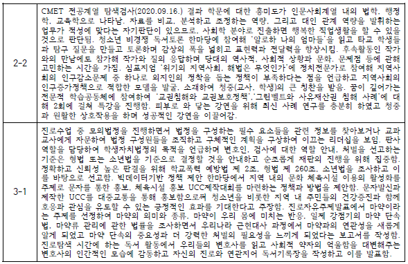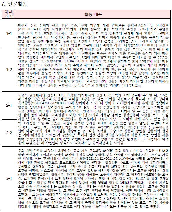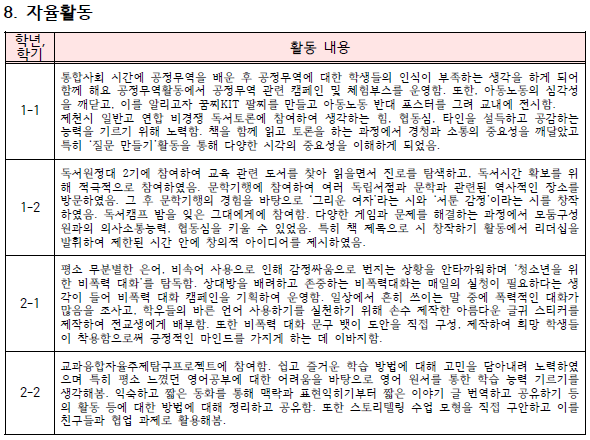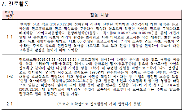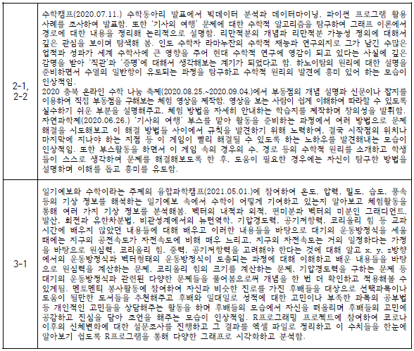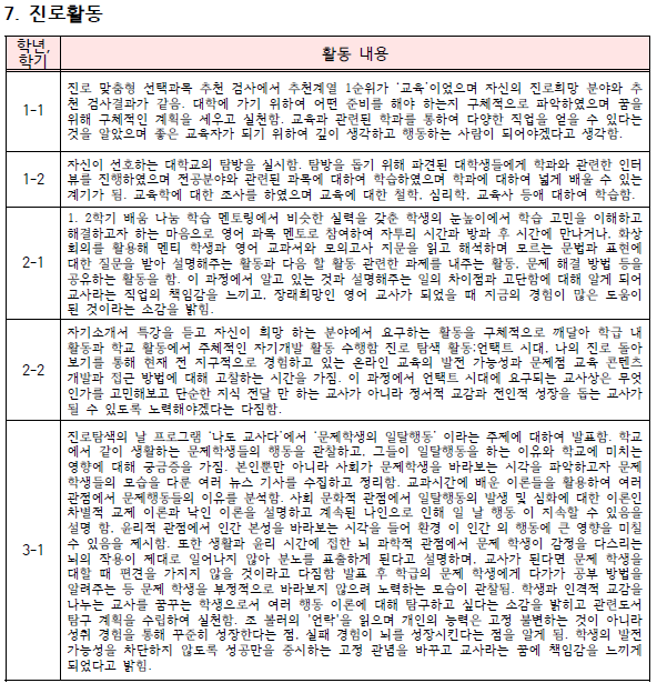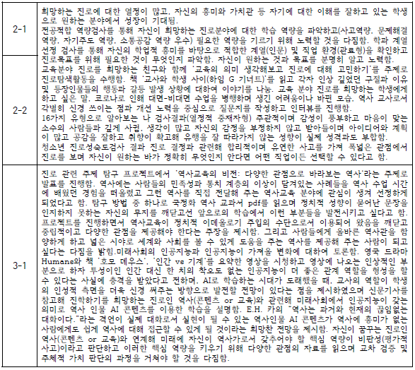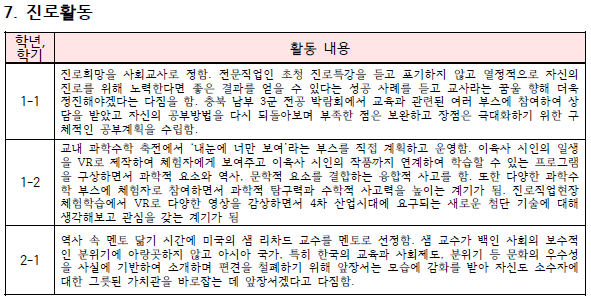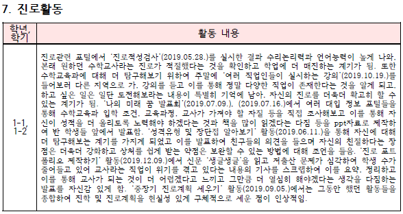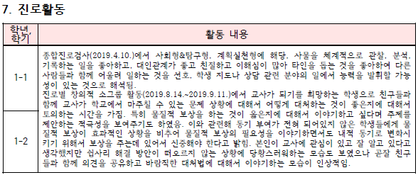 | 고등학교 과목별 세특 (세부능력 및 특기사항) 사례(예시) - 인문계열(국어, 수학, 영어, 사회 등) (0) | 2023.02.05 |