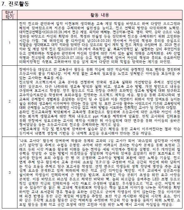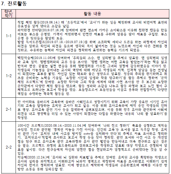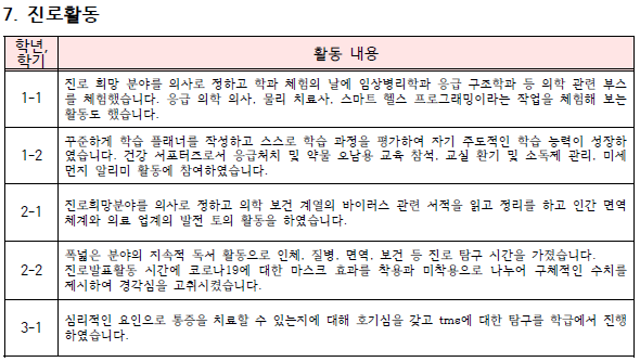 | 진로활동 세특 예시 - 자연계열(의대, 간호학과 포함) (0) | 2023.02.05 |
