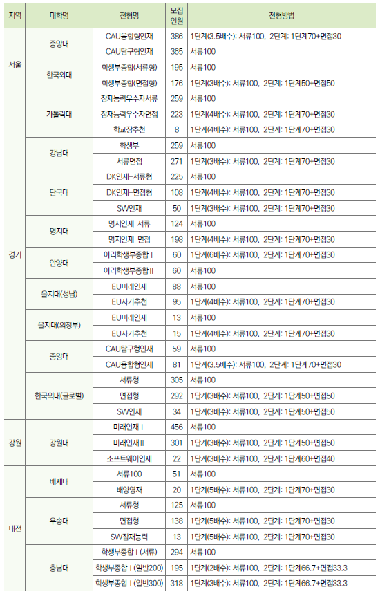 | 2024학년도 학생부종합전형(학종) 대학별 전형방법 및 수능최저등급 (0) | 2023.04.10 |