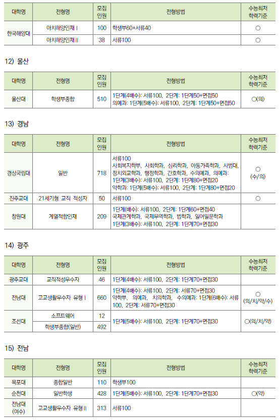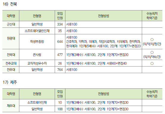 | 2024학년도 수시 특별전형 기회균형전형(의,약학 및 예체능 제외) -기회균형통합전형, 농어촌전형, 기초생활수급자 및 차상위계층 전형 (0) | 2023.04.12 |