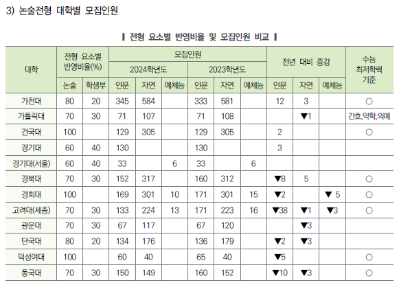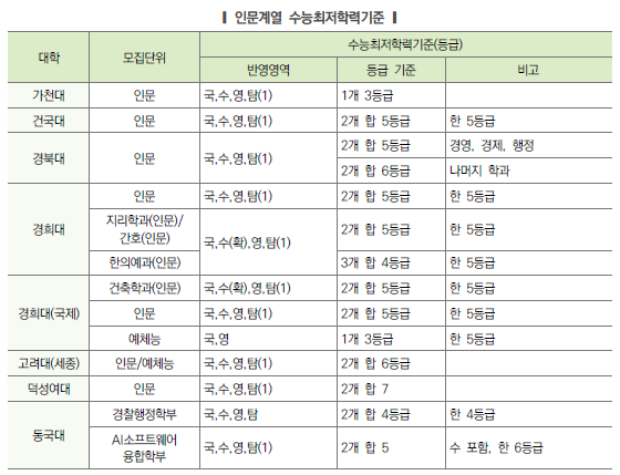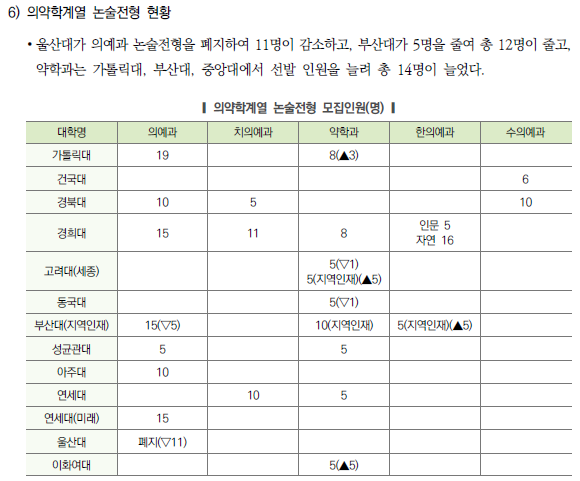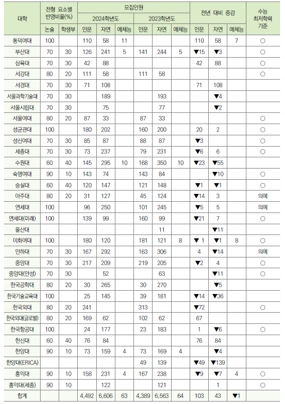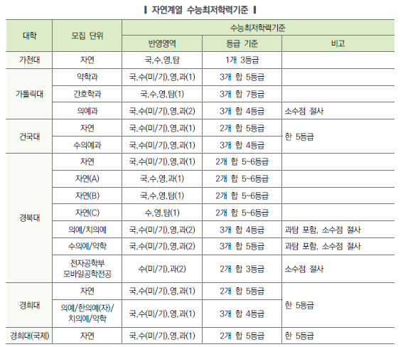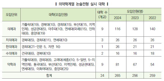 | 2024학년도 수시 특별전형 지역인재전형 (의대, 치대, 약대, 한의대, 수의대, 간호학과, 교대 포함) 전형방법 및 수능최저등급 (0) | 2023.04.12 |