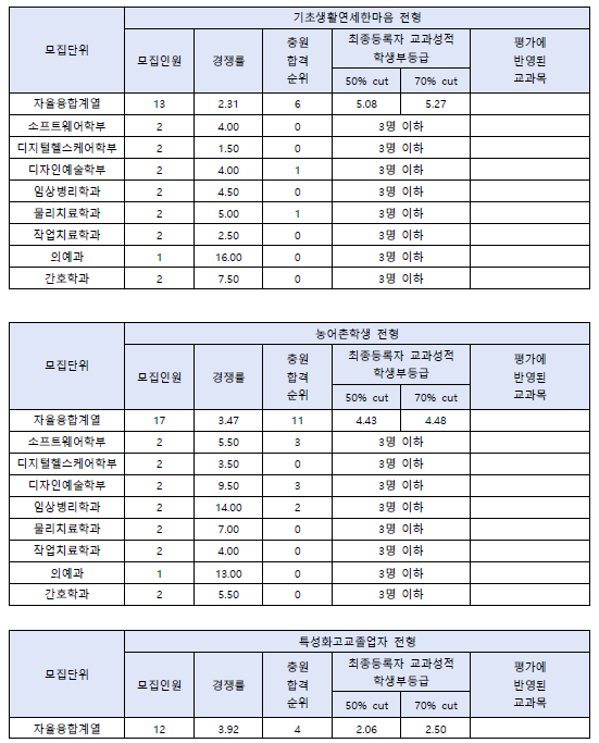 | 2023학년도 용인대, 울산대, 우석대 수시, 정시 입시결과(커트라인) (0) | 2023.08.24 |
