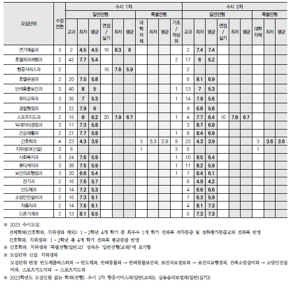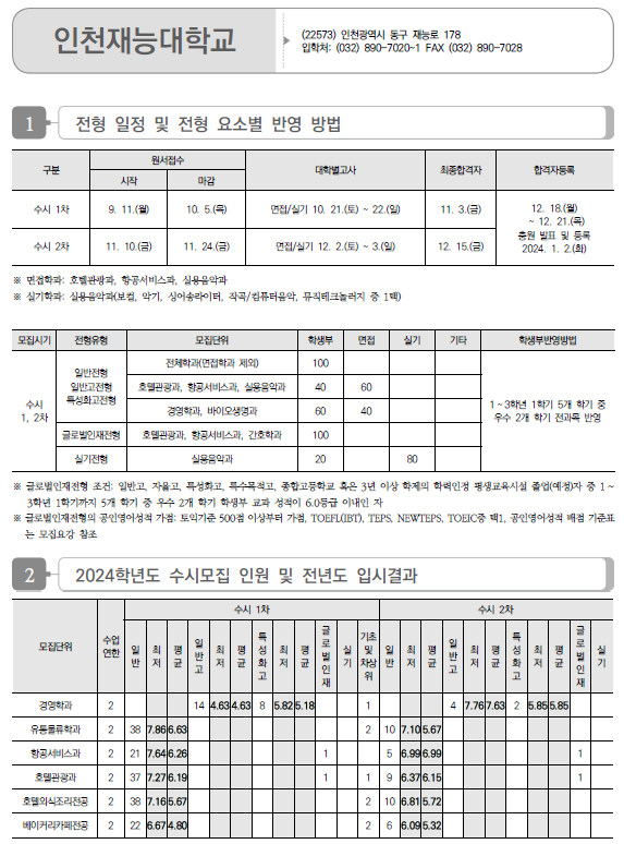 | 2024학년도 인하공업전문대, 장안대, 청강문화산업대, 한국관광대, 한양여자대 수시 일정 및 반영 방법, 입시결과(커트라인) (0) | 2023.09.06 |