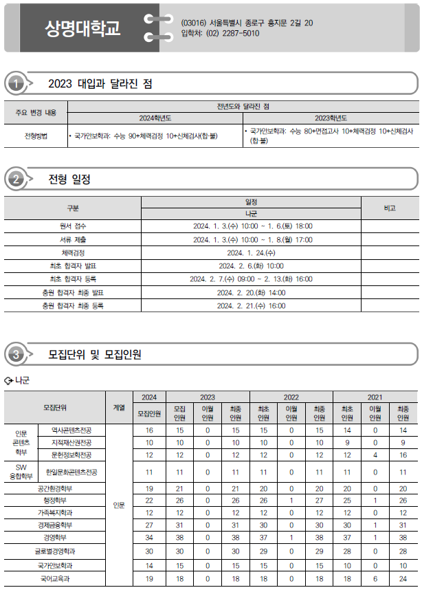 | 2024학년도 명지대, 동덕여대, 삼육대 정시 가나다군 모집요강, 반영방법 및 전년도 입시결과(커트라인) (0) | 2023.12.16 |