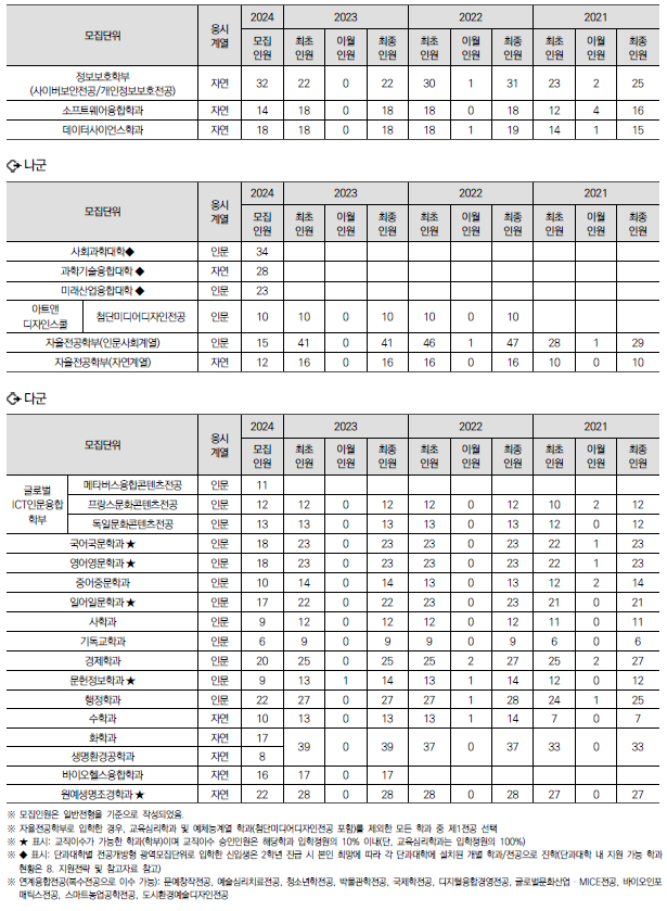 | 2024학년도 명지대, 동덕여대, 삼육대 정시 가나다군 모집요강, 반영방법 및 전년도 입시결과(커트라인) (0) | 2023.12.16 |