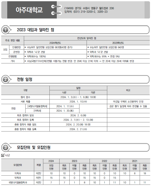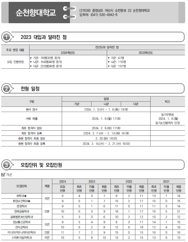 | 2024학년도 인천대, 인천가톨릭대, 을지대 정시 가나다군 모집요강, 반영방법 및 전년도 입시결과(커트라인) (0) | 2023.12.20 |