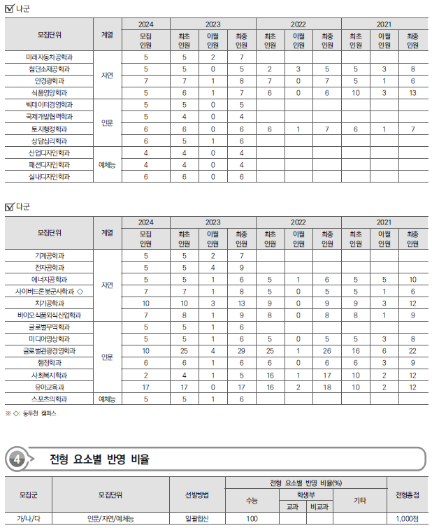 | 2024학년도 단국대(죽전), 단국대(천안), 배석대 정시 가나다군 모집요강, 반영방법 및 전년도 입시결과(커트라인) (0) | 2023.12.20 |
