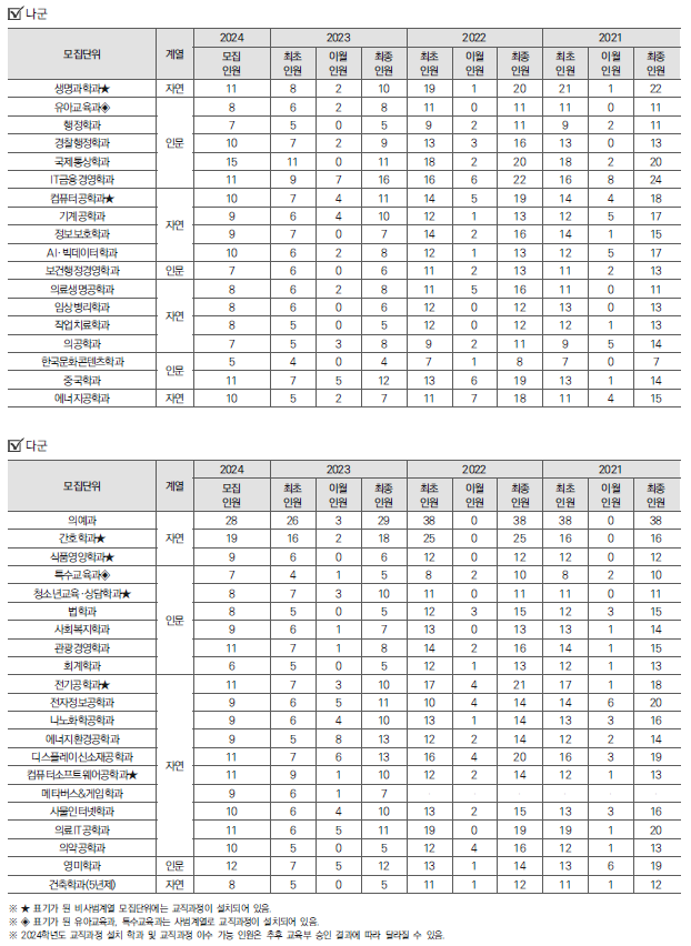 | 2024학년도 고려대(세종), 공주대, 대진대 정시 가나다군 모집요강, 반영방법 및 전년도 입시결과(커트라인) (0) | 2023.12.18 |