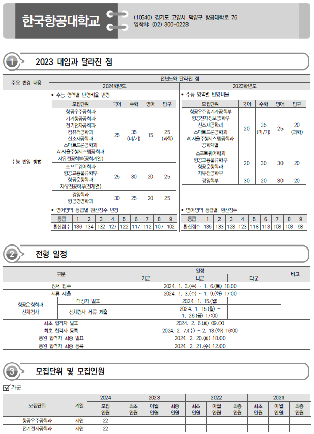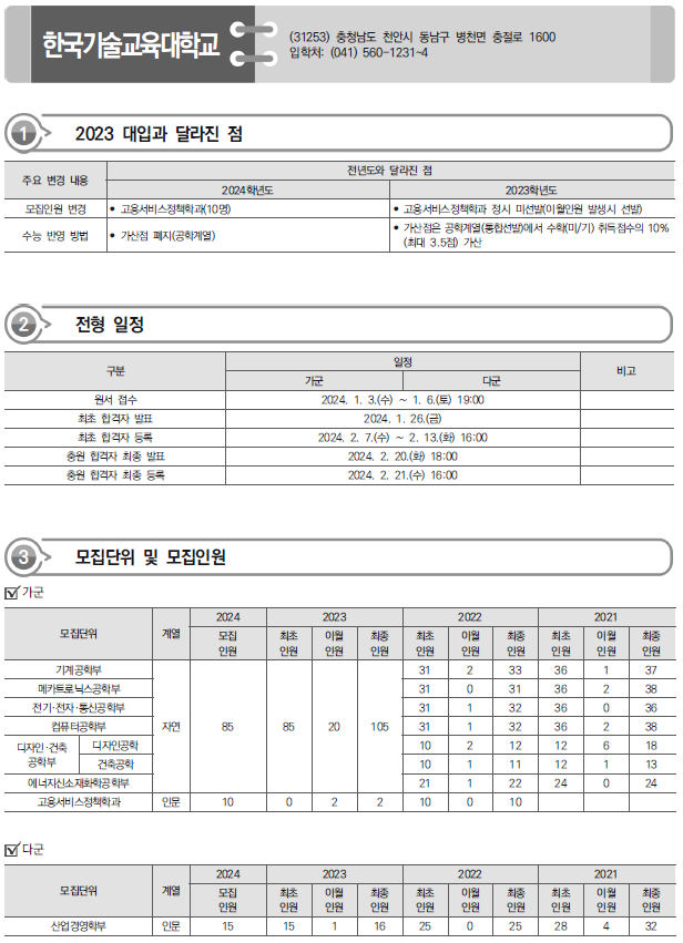| 2024학년도 한국공학대, 한국교통대, 한국교원대 정시 가나다군 모집요강, 반영방법 및 전년도 입시결과(커트라인) (0) | 2023.12.20 |