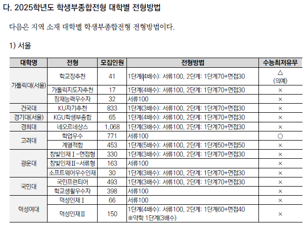| 2025학년도 수시 모집 - 특별전형(기회균형,고른기회,사회통합,사회배려자,국가보훈,저소득층,농어촌,특성화고,기초생활,차상위,한부모,장애인) (0) | 2024.01.24 |