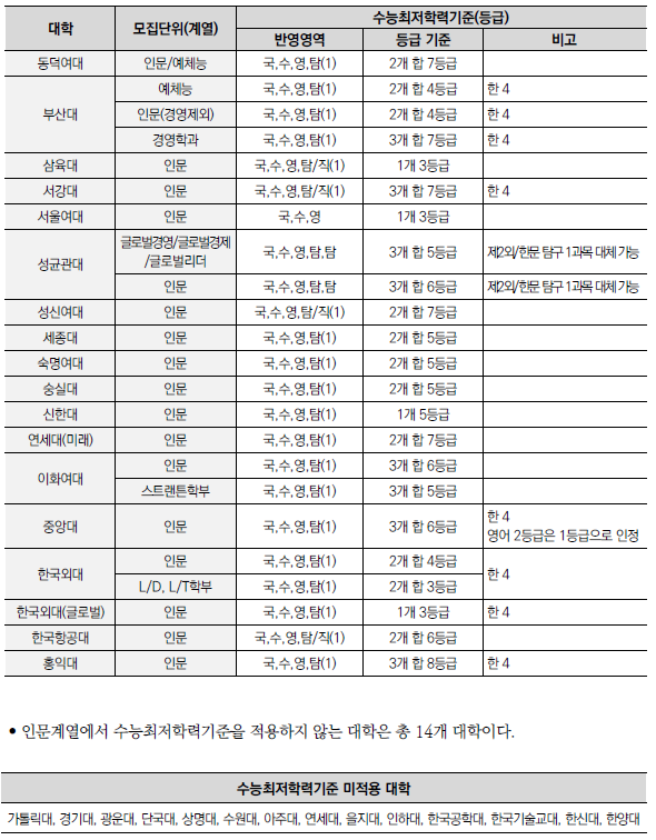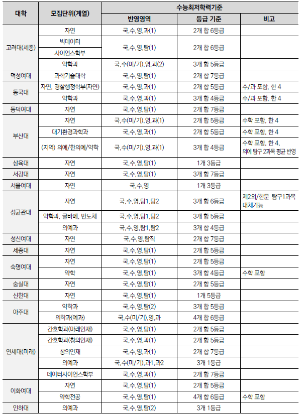 | 2025학년도 수시 모집 - 학생부종합전형(학종) 특징(평가방법,권장과목,수능최저) (0) | 2024.01.22 |