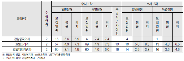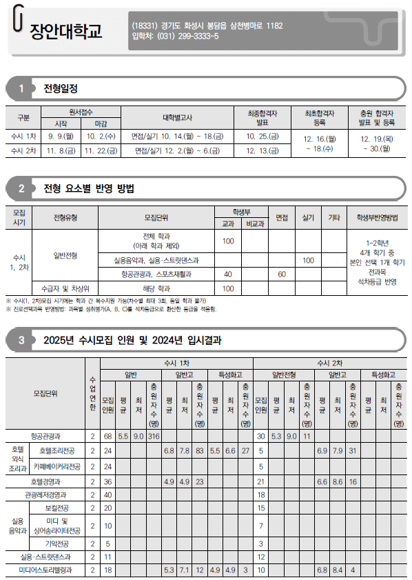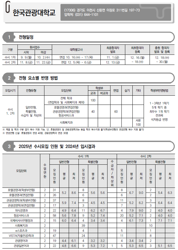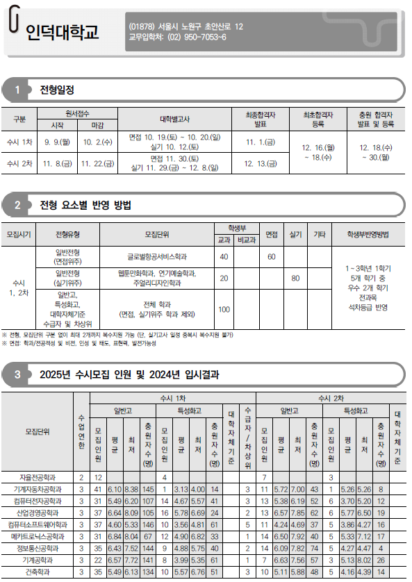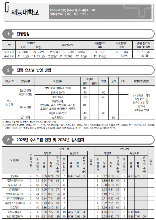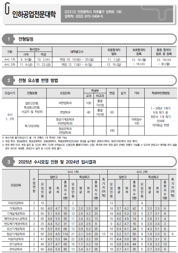 2025학년도 인하공업전문대, 한양여대, 인덕대, 재능대, 장안대, 청강문화산업대, 한국관광대 수시 모집요강 및 전년도 입시결과(커트라인)-모집일정, 인원, 반영방법 등