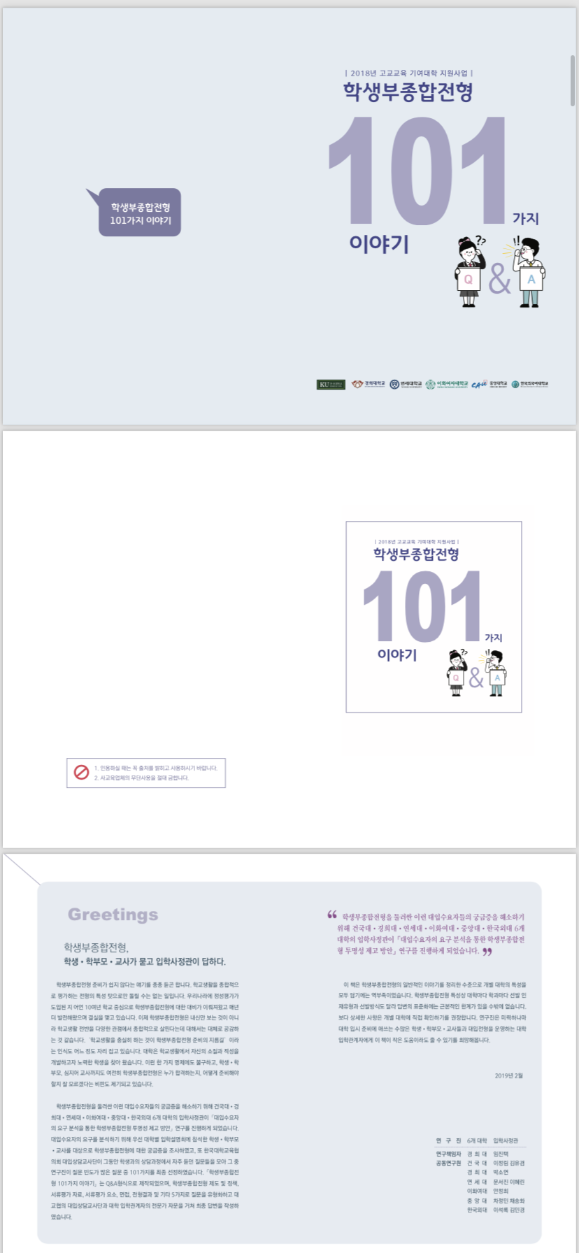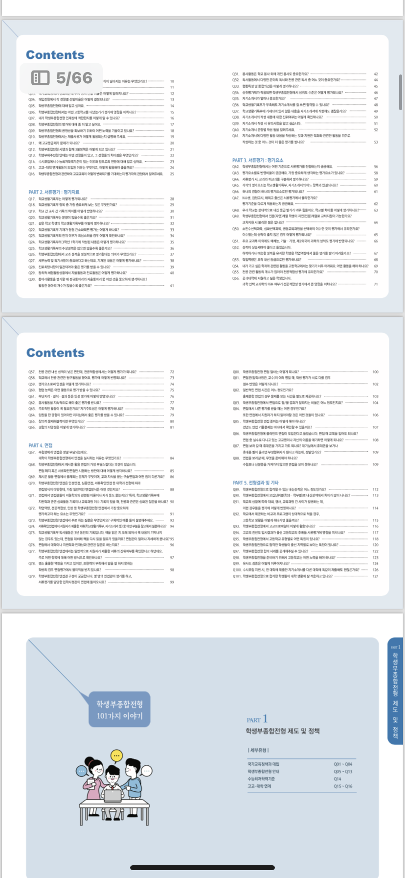 학생, 학부모, 교사와의 상담과정 중 자주 듣던 질문들을 모아 빈도가 가장 많은 질문 101가지를 선정하고 그에 대한 답변을 작성한 소책자 입니다.