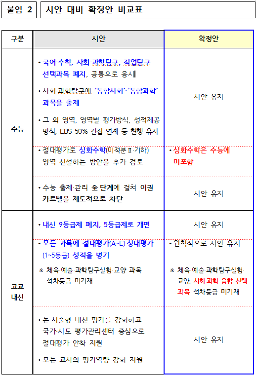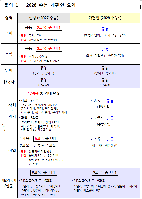□ 올해 중학교 2학년 학생들이 치르는 2028학년도 대학입시제도가 확정되었다. 교육부(부총리 겸 교육부장관 이주호)는 지난 10월 10일(화) 「2028 대학입시제도 개편 시안」(이하 ‘시안’)을 발표하고, 국가교육위원회(위원장 이배용)에 의견 수렴을 요청하였으며, 국가교육위원회는 시안에 대하여 심층 논의를 거쳐 지난 12월 22일(금) 심의·의결한 바 있다.