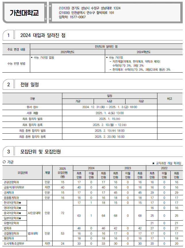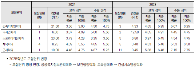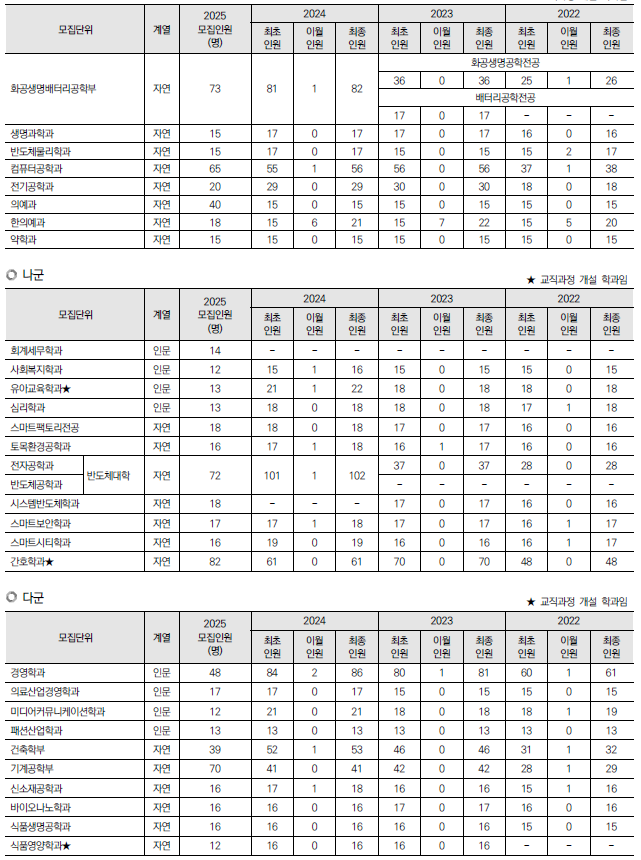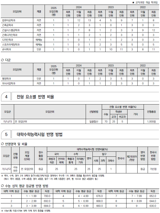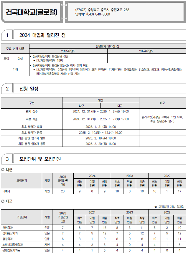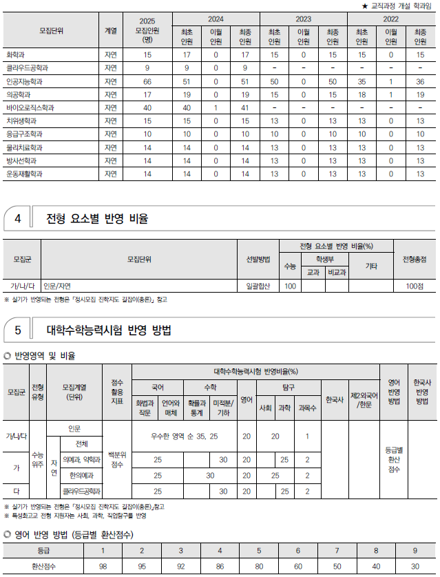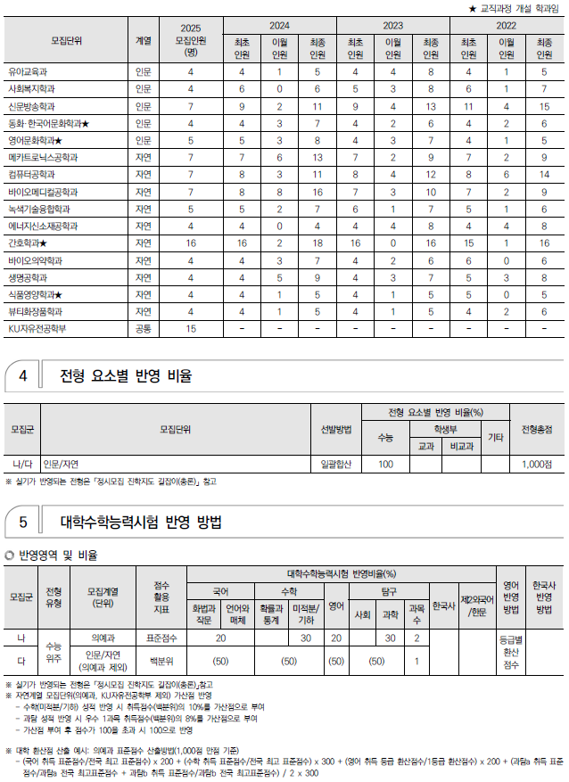 | 2025학년도 고려대(세종), 한국교통대, 강남대 정시 모집 요강(반영방법 등) 및 전년도 입시결과(커트라인) (0) | 2024.12.10 |