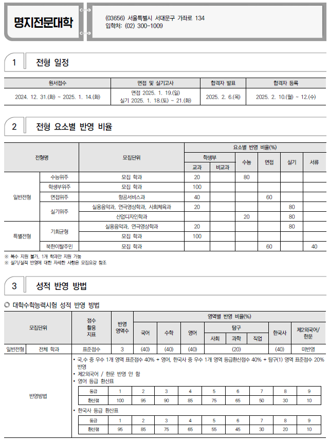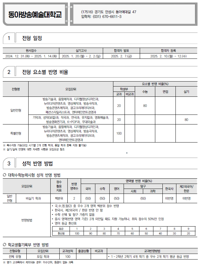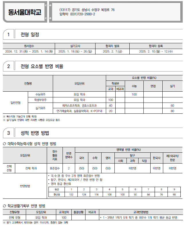 2025학년도 동서울대, 동아방송예술대, 동양미래대, 두원공과대, 명지전문대 정시 모집 요강(반영방법 등) 및 전년도 입시결과(커트라인)