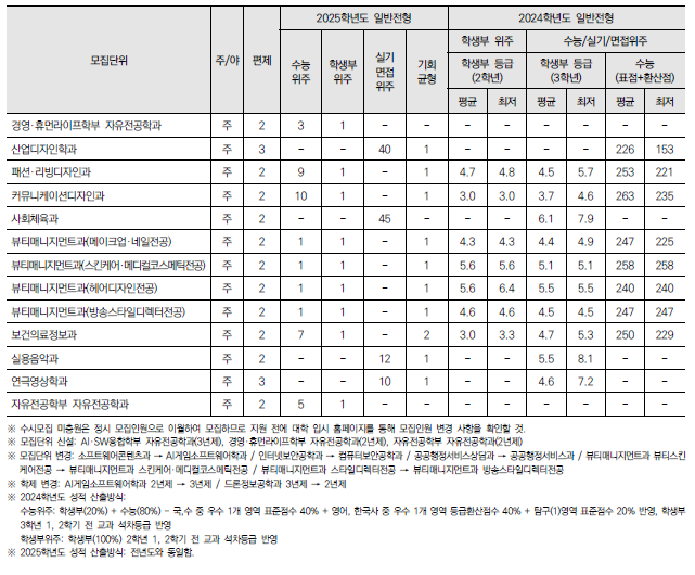 2025학년도 서울예대, 서일대, 수원과학대, 수원여대, 숭의여대 정시 모집 요강(반영방법 등) 및 전년도 입시결과(커트라인)