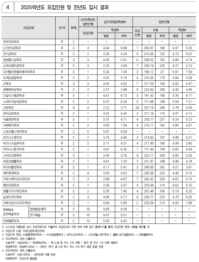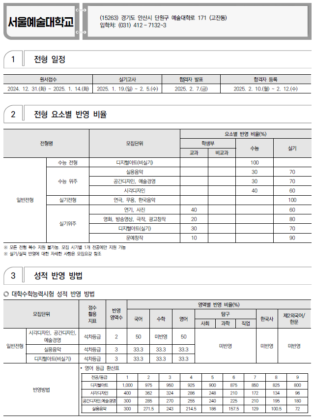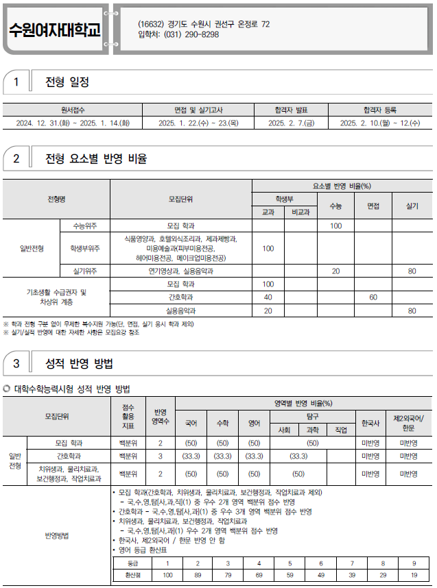 2025학년도 서울예대, 서일대, 수원과학대, 수원여대, 숭의여대 정시 모집 요강(반영방법 등) 및 전년도 입시결과(커트라인)