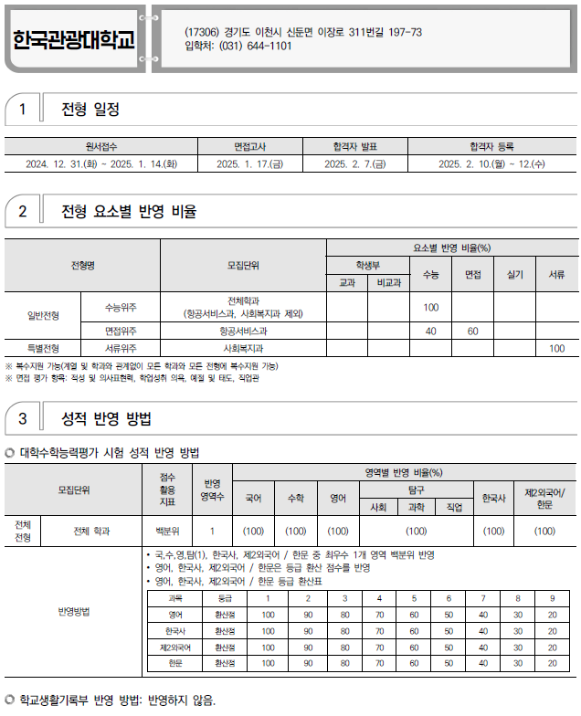 | 2025학년도 오산대, 용인예술과학대, 웅지세무대, 유한대, 인덕대, 재능대 정시 모집 요강(반영방법 등) 및 전년도 입시결과(커트라인) (0) | 2024.12.26 |