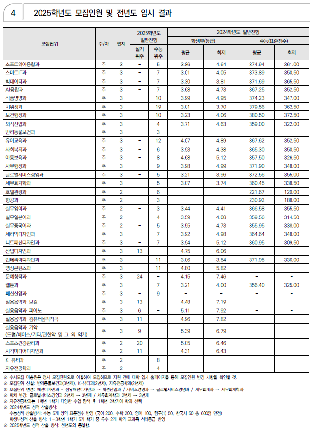 | 2025학년도 서울예대, 서일대, 수원과학대, 수원여대, 숭의여대 정시 모집 요강(반영방법 등) 및 전년도 입시결과(커트라인) (1) | 2024.12.25 |