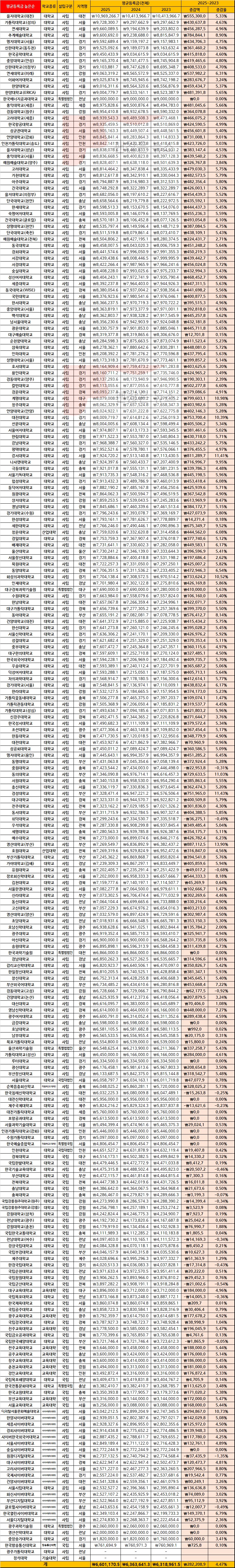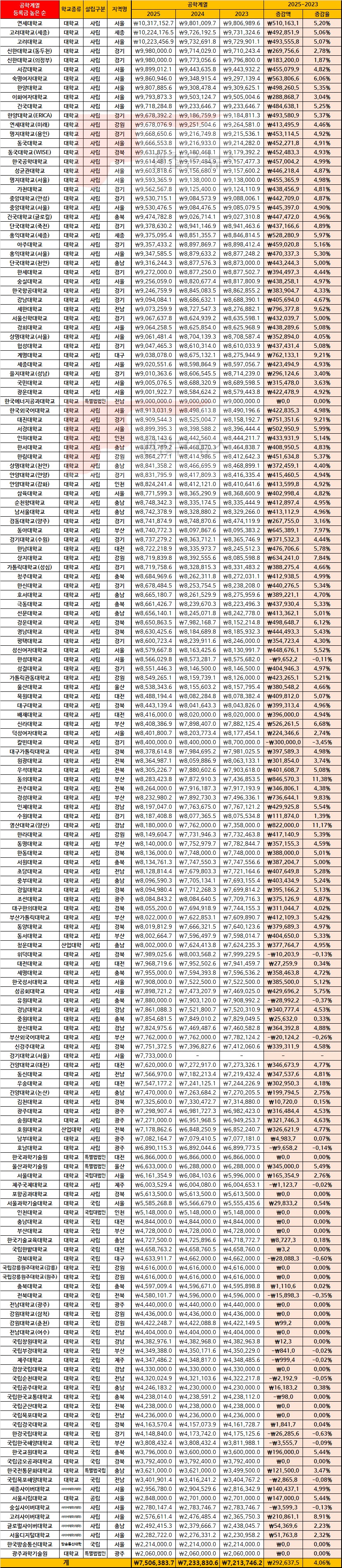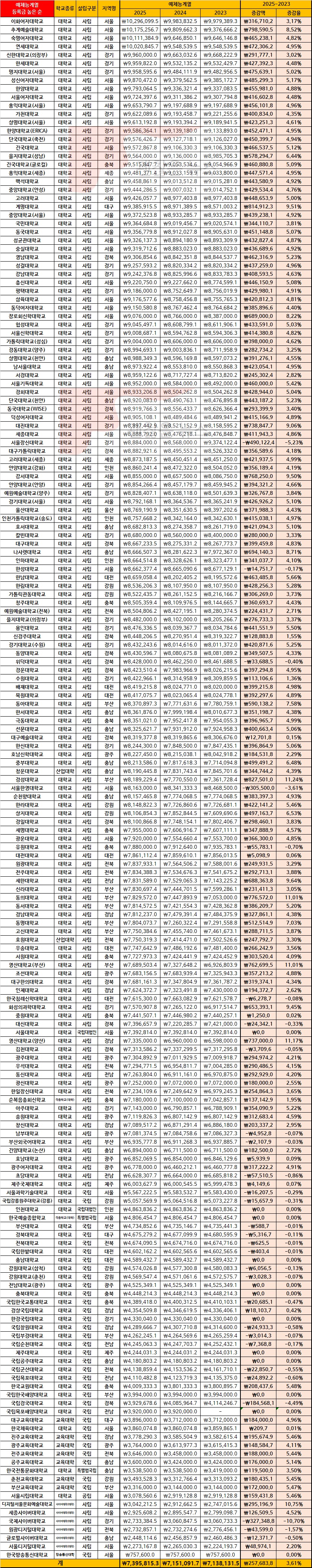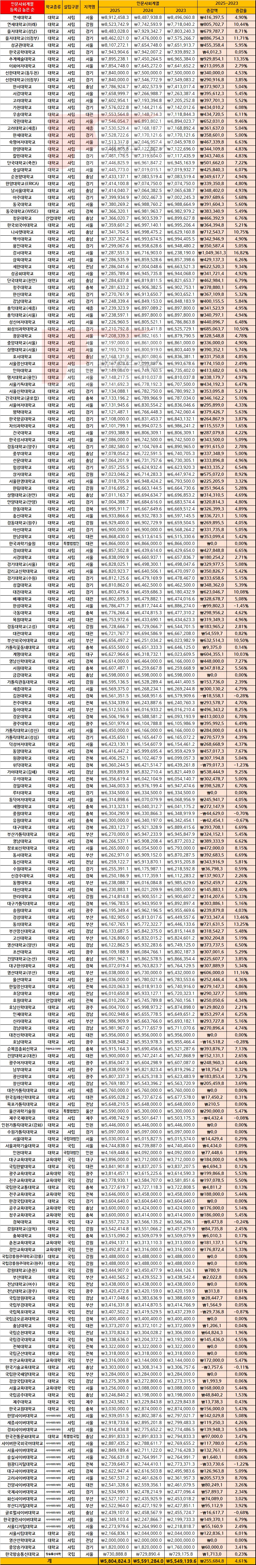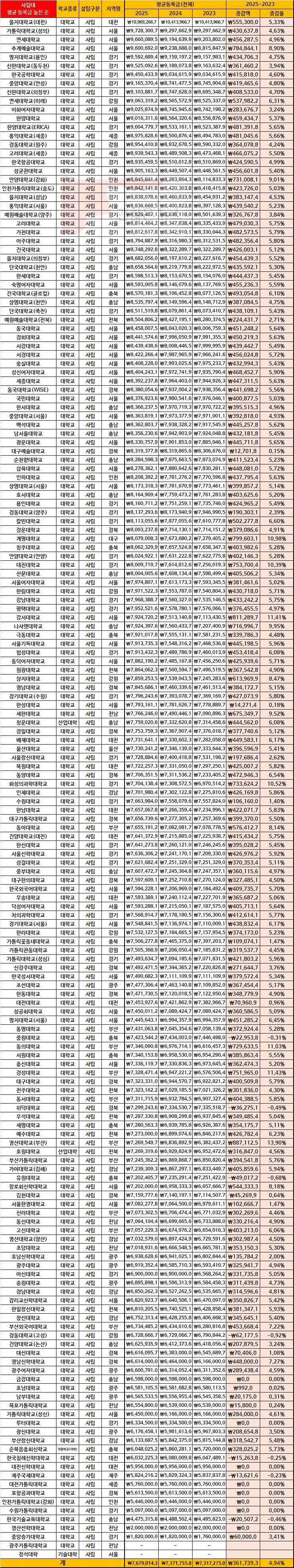 ▶ 국공립, 특별법인 대학 등 평균등록금 높은 순