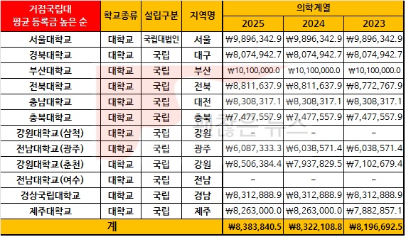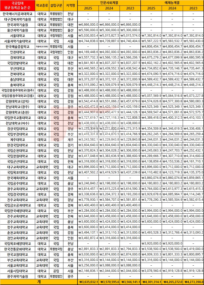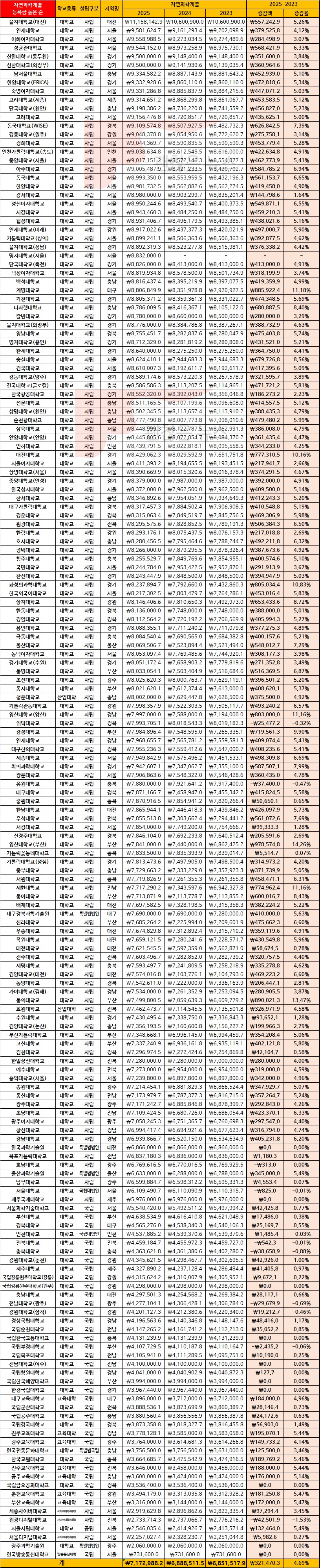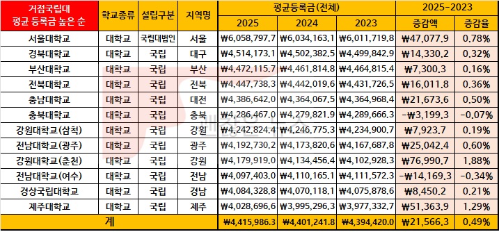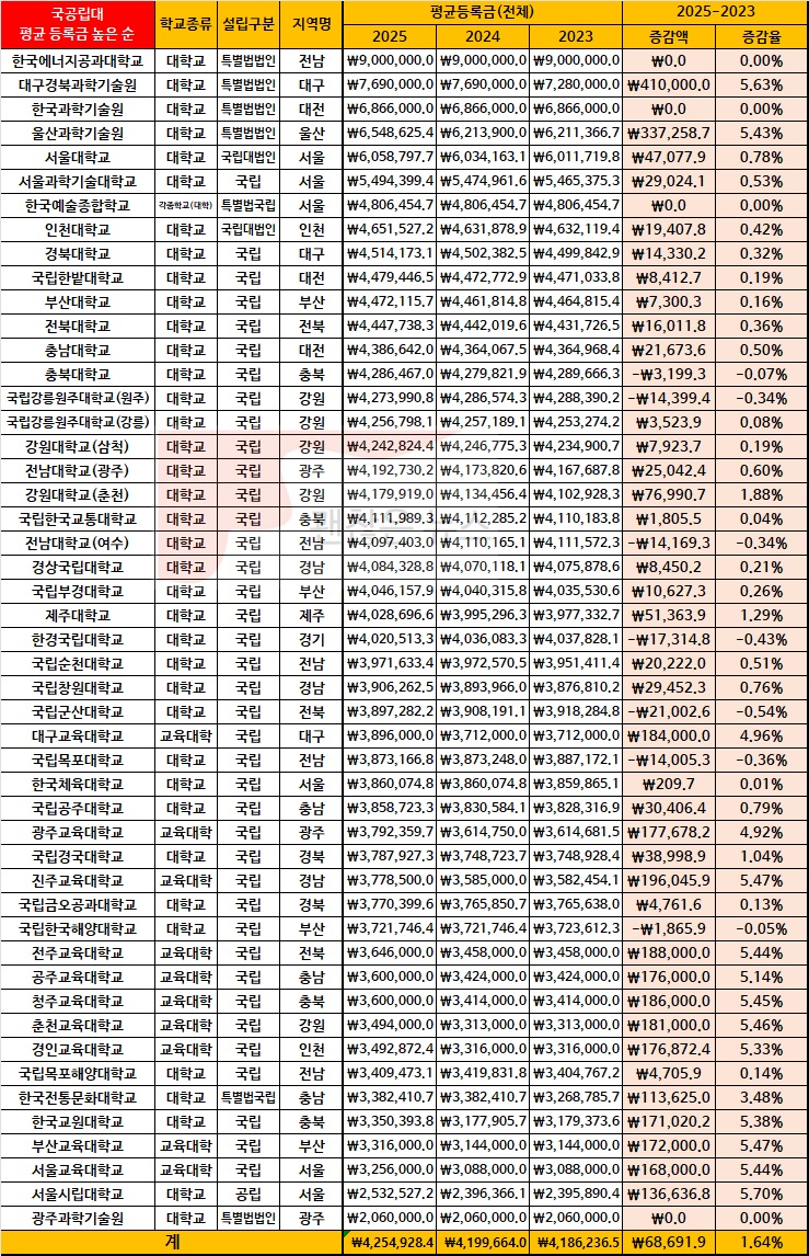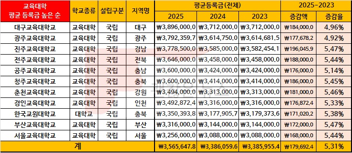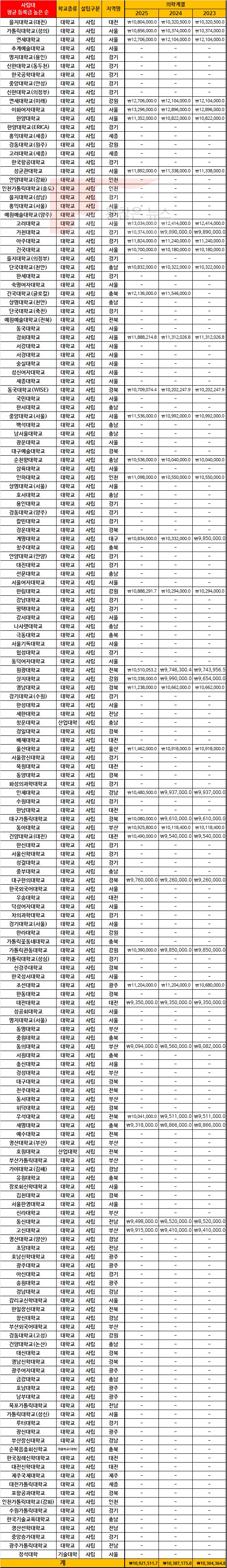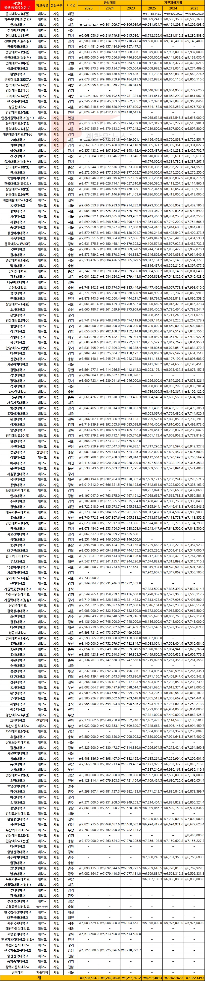 ▶ 국공립, 특별법인 대학 등 평균등록금 높은 순