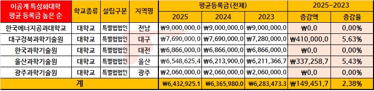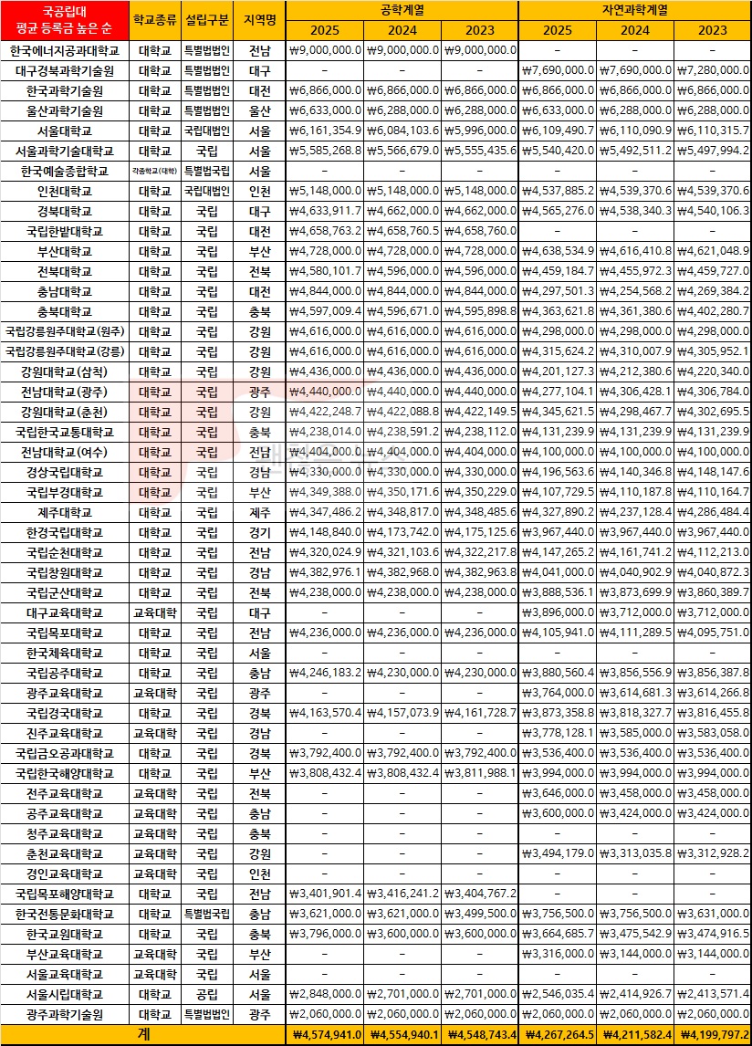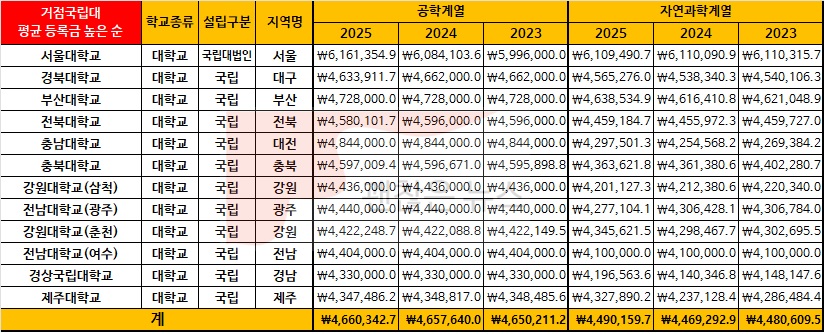 ▶ 국공립, 특별법인 대학 등 공학계열, 자연과학계열 등록금