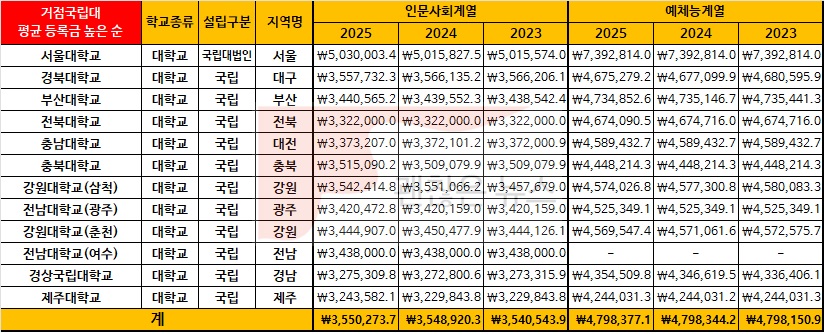 ▶ 거점국립대 인문사회, 예체능계열 등록금