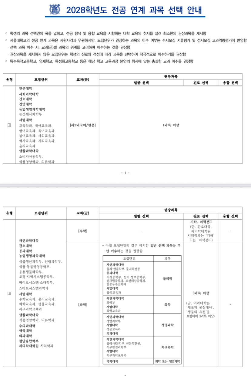 2028학년도 서울대학교 전공 연계 과목 선택 안내 -권장과목