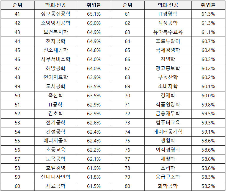 ■ 2019 4년제 대학 전공,학과별 졸업생 취업률 순위