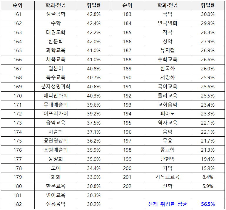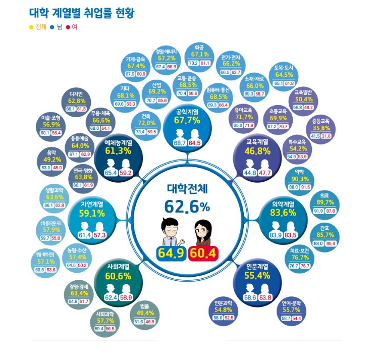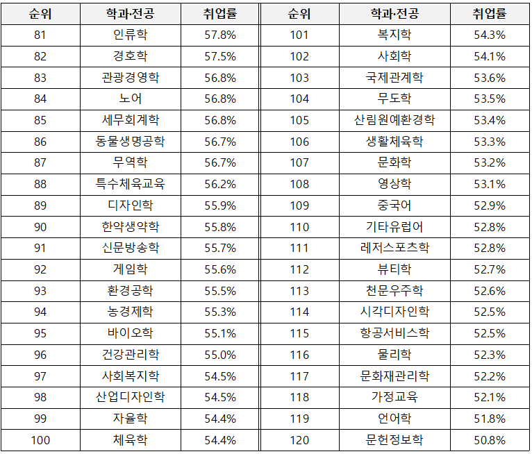 -취업률은 취업가능자 수 대비 취업자 수로 계산했다. 취업가능자는 대학,학과별 전체 졸업자 가운데 진학자, 입대자, 취업불가능자, 외국인 유학생 등을 제외한 수이다.