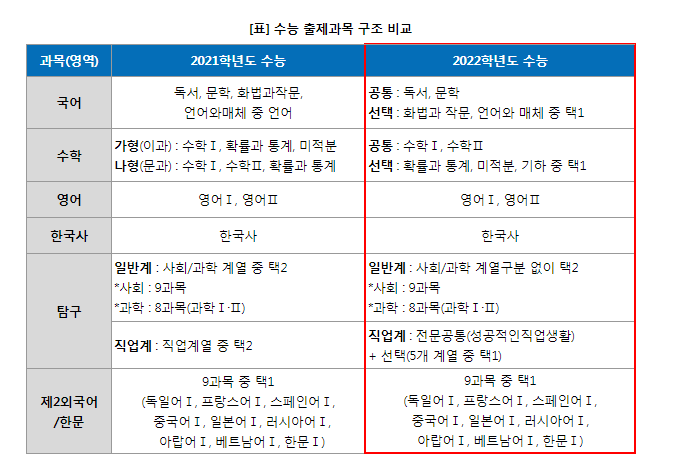 - 한국교육과정평가원의 설명에 따르면 국어영역과 수학영역은 '공통과목+선택과목'구조로 실시되는데 이는 '공통과목' 점수를 활용해 선택과목 점수의 조정 절차를 거친 후 표준점수와 등급을 산출한다. 이에 따라 특정 선택과목을 응시한 수험생 집단의 공통과목 점수가 평균적으로 높은 경우 이들의 선택과목 점수는 다른 선택과목을 응시한 수험생들에 비해 상향 조정 될 수 있다.