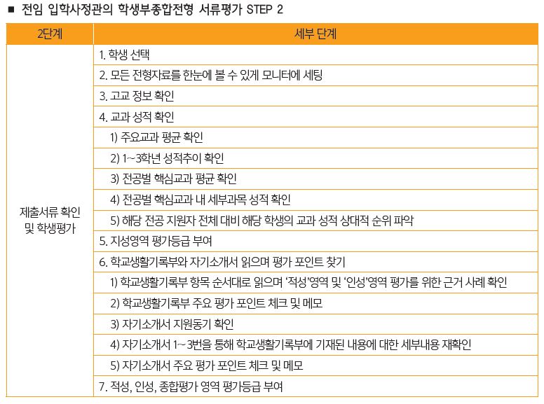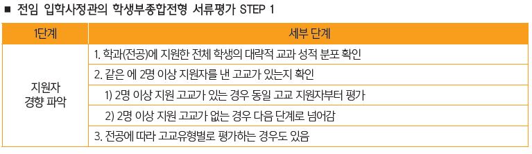 -세 번째 단계에서는 지금까지 평가과정을 올바르게 밟아왔는지를 확인한다. 먼저, 지원자 전체의 서류평가 종합순위를 확인하는 것이다. 그런 다음 최종 선발 범위에 든 학생의 평가 결과는 다시 한번 확인한다.