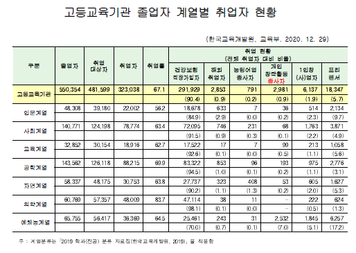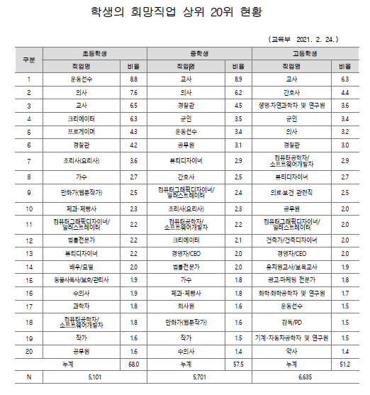 □ 교육부 발표 2021년도 초중고 학생들의 희망직업 및 계열별 취업률 현황