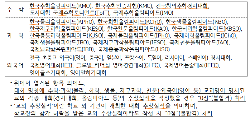③ 학교생활기록부에 기재할 수 없는 항목[교외 수상실적, 교외 인증시험 참여 사실이나 성적, 논문 등재나 학회발표, 도서 출간, 지식재산권(특허, 실용신안, 상표, 디자인) 출원이나 등록, 해외 활동 실적 등]은 작성할 수 없고 , 어학연수 등 사교육 유발요인이 큰 교외 활동의 경우에도 작성이 제한됩니다.
