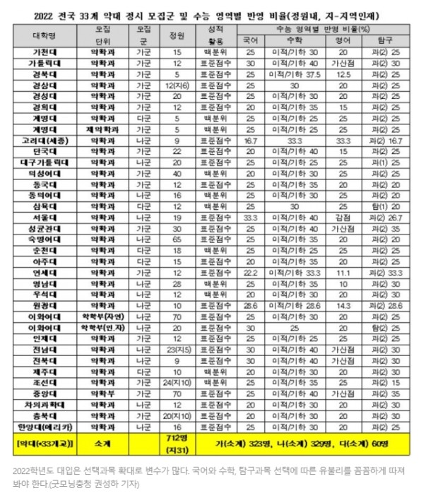 - 목포대, 충남대, 강원대, 부산대 네 곳을 제외한 전국 약대 33곳의 2022학년도 모집정원과 모집시기, 선발 방법이 발표됐다.