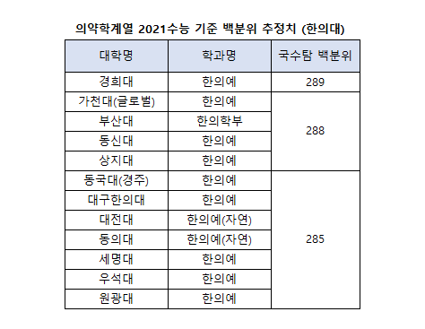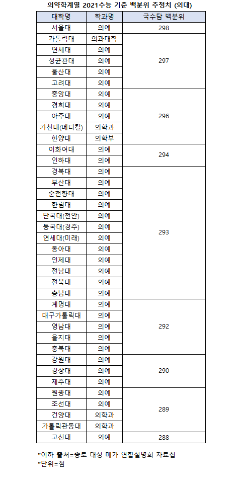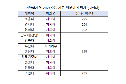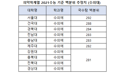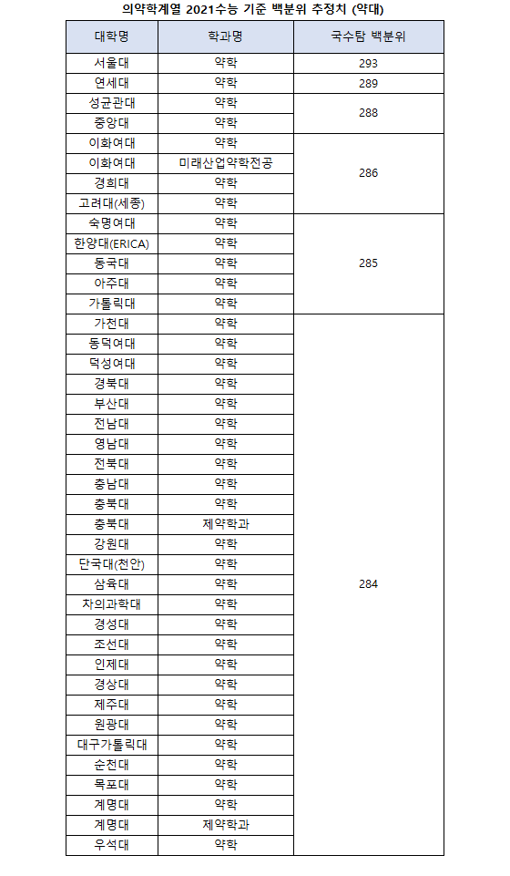□ 올해 약대 37개교가 합류한 111개 의약학계열 의대 30개 대학 2973명, 약대 37개 대학 1743명, 치의대 11개 대학 631명, 한의대 12개 대학 724명, 수의대 10개 대학 497명 전체를 대상으로 국어, 수학, 탐구 영역의 백분위 추정 점수.