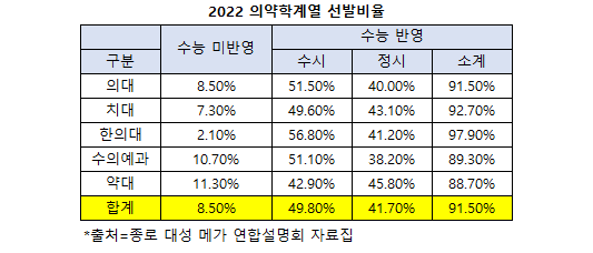 - 인문계 지원 가능 의약계열은 의대 1개(이화여대), 한의대 5개교(대구한의대, 경희대, 원광대, 동국대경주, 동의대), 약대 2개교(이화여대, 인제대)로 총 132명을 계열별 분리모집을 시행.