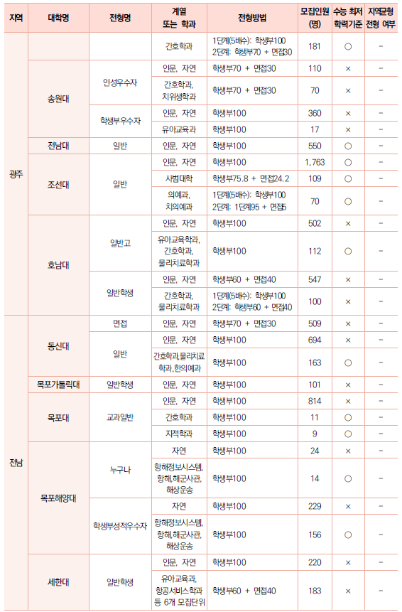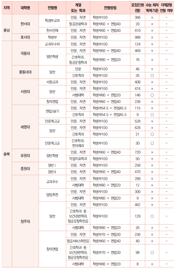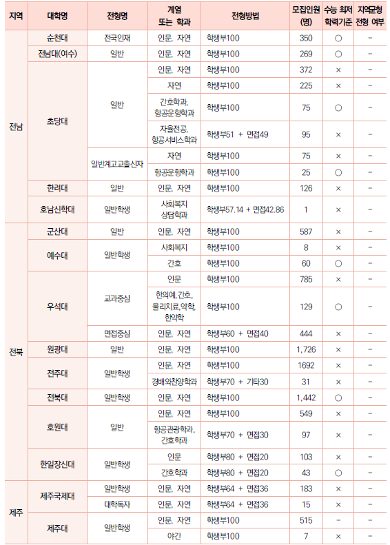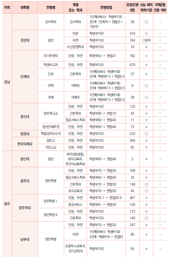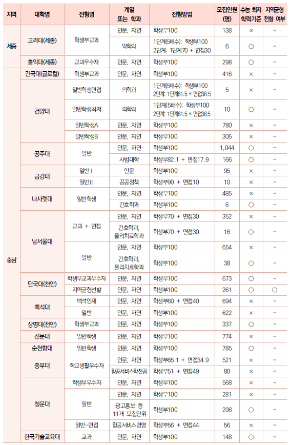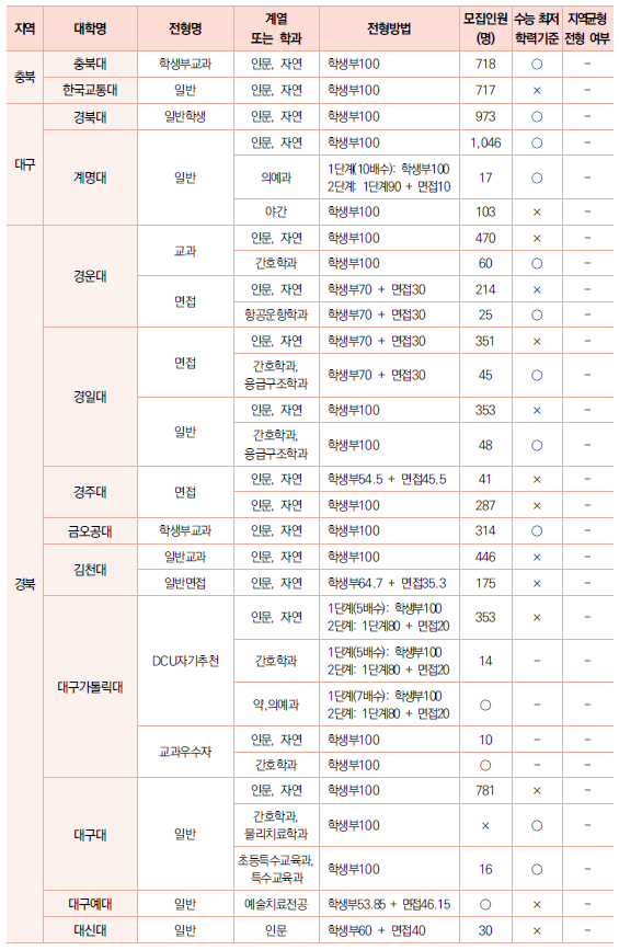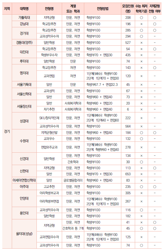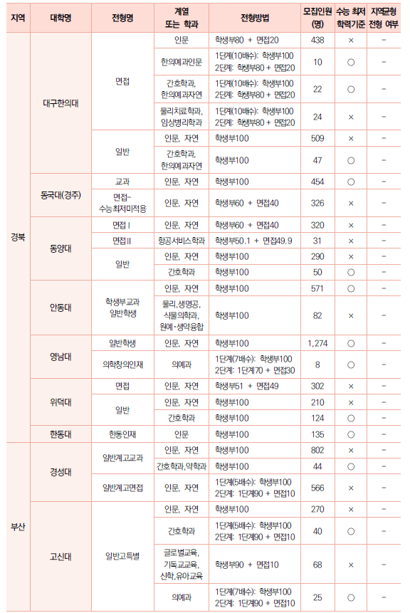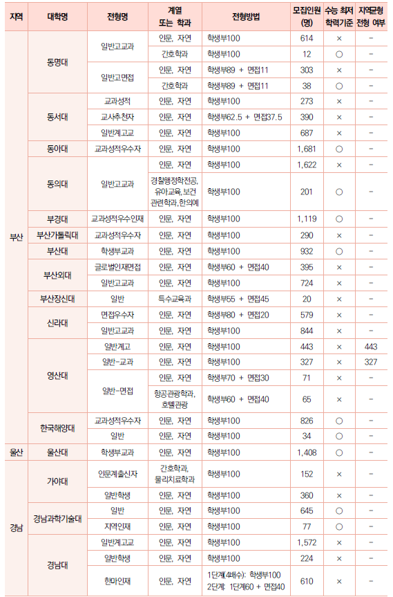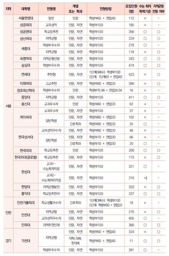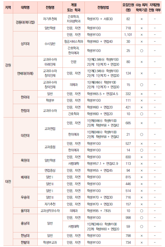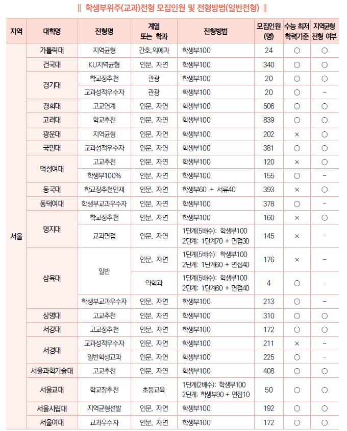 □ 전국 대학별 학생부교과전형 모집인원 및 일반전형방법