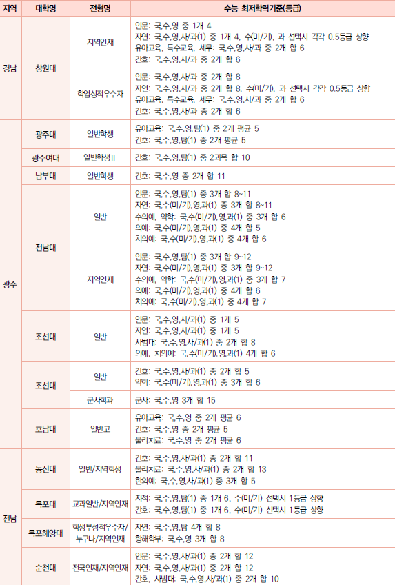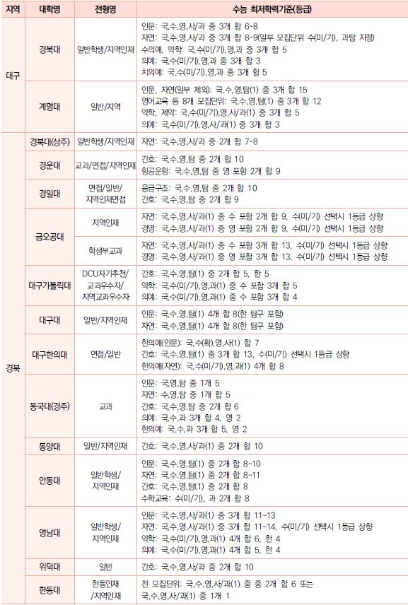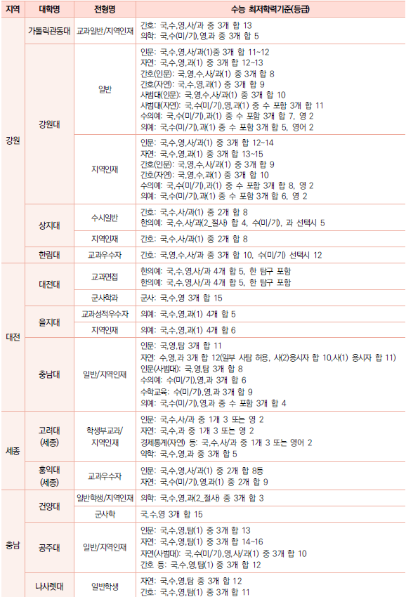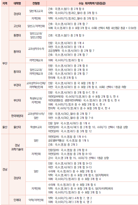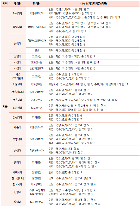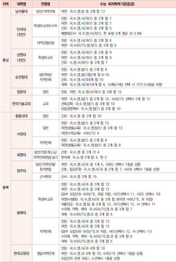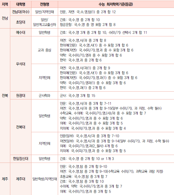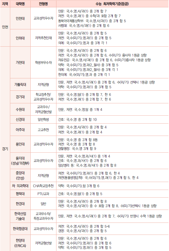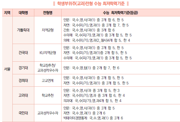 □ 학생부교과전형의 각 전형별 수능 최저학력기준