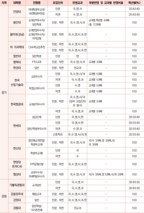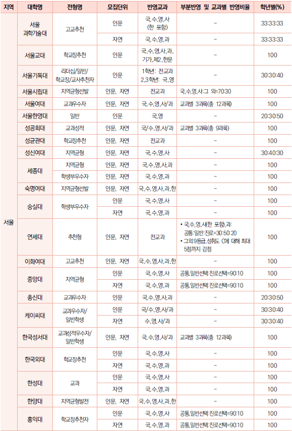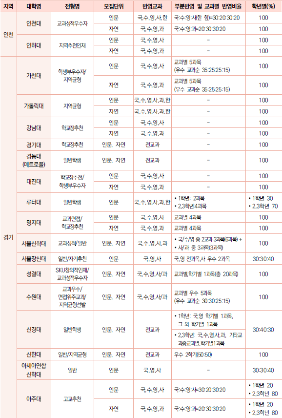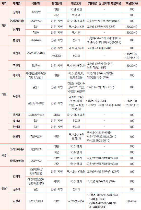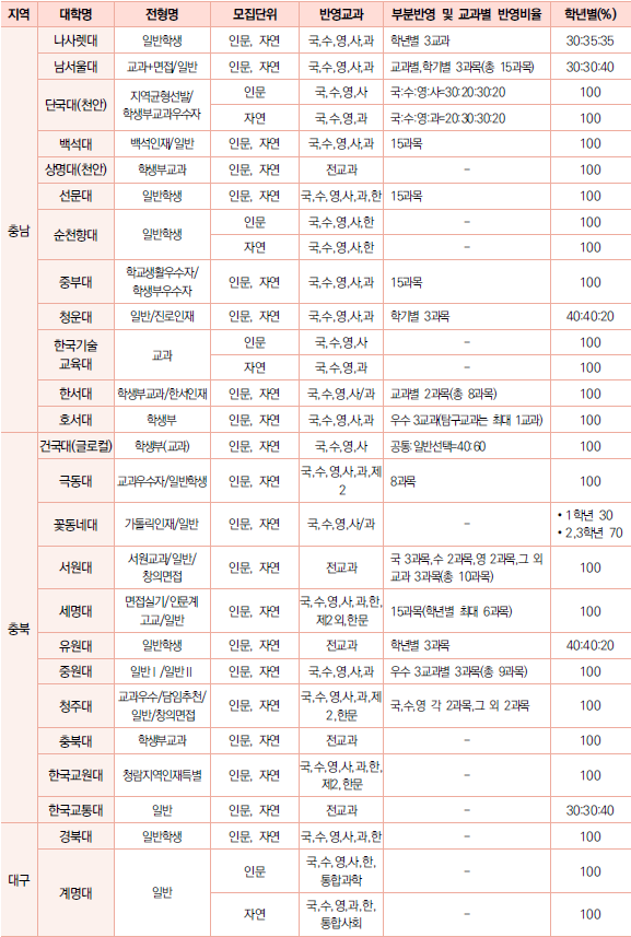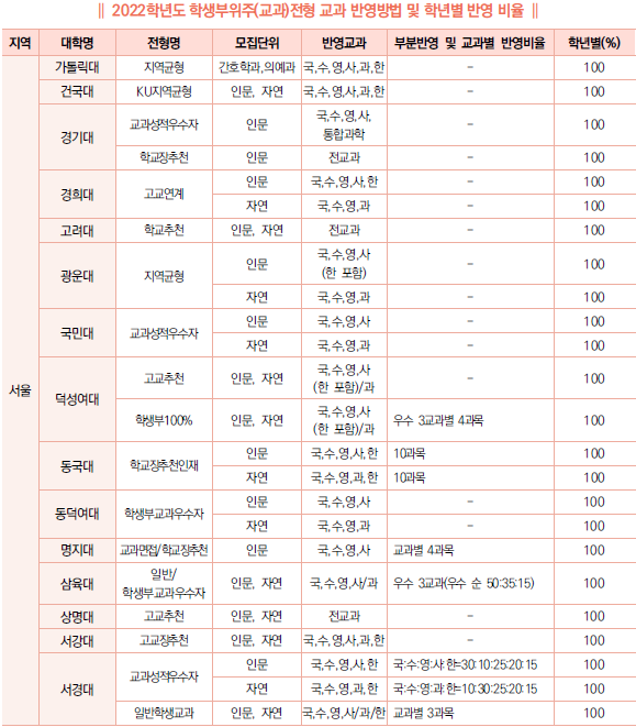 □ 학생부교과전형의 교과 반영방식은 대학에 따라 교과 반영방법과 학년별 반영 비율 등이 매우 다양하다. 반영방법에 따라 유불리가 발생할 수 있어서 대학별 반영방법을 꼼꼼히 살펴봐야 한다.