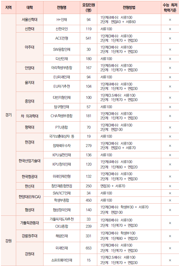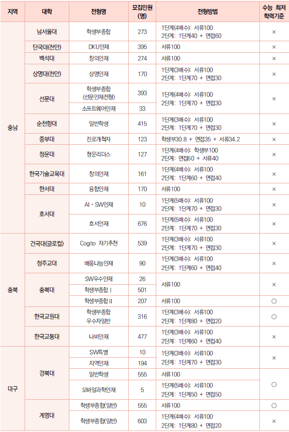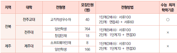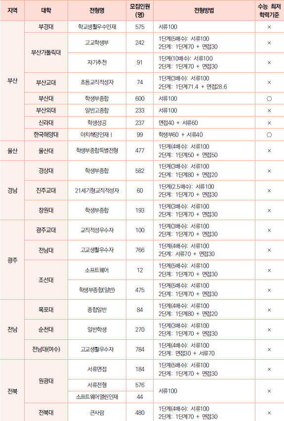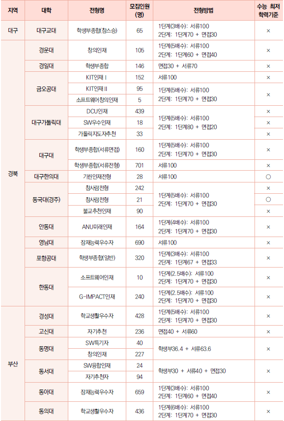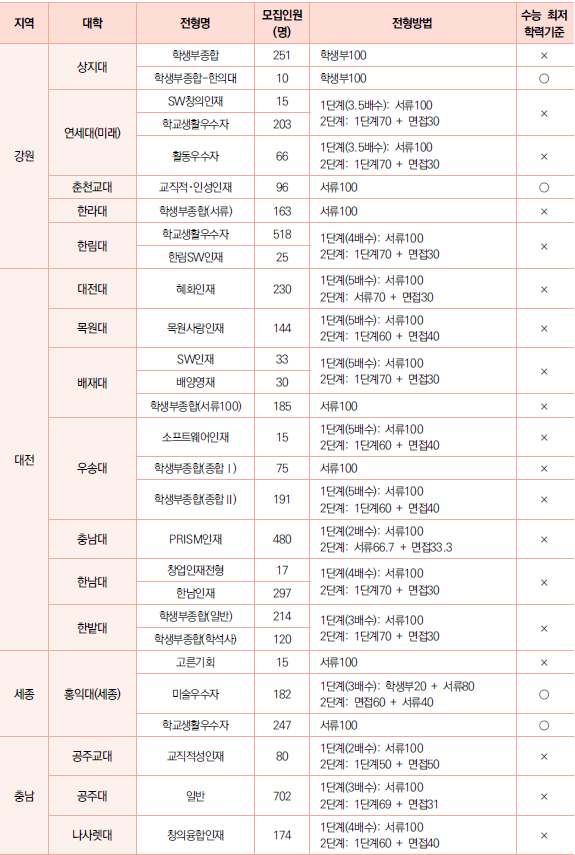 | 2022학년도 학생부종합전형 지방대 대학별 제출서류 (0) | 2021.04.27 |