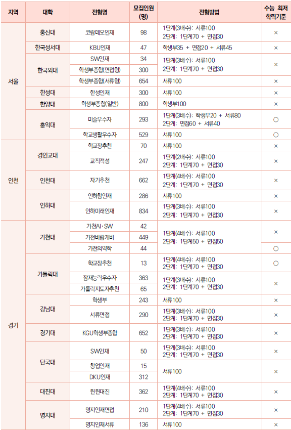 □ 수시 전형에서 모집인원의 규모가 가장 큰 전형은 학생부교과전형이지만, 서울지역 대학은 학생부종합전형의 모집인원이 더 많다.