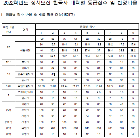 □ 2022학년도 정시 한국사 대학별 등급점수 및 반영비율