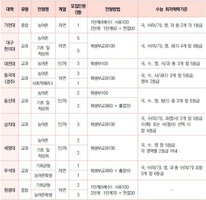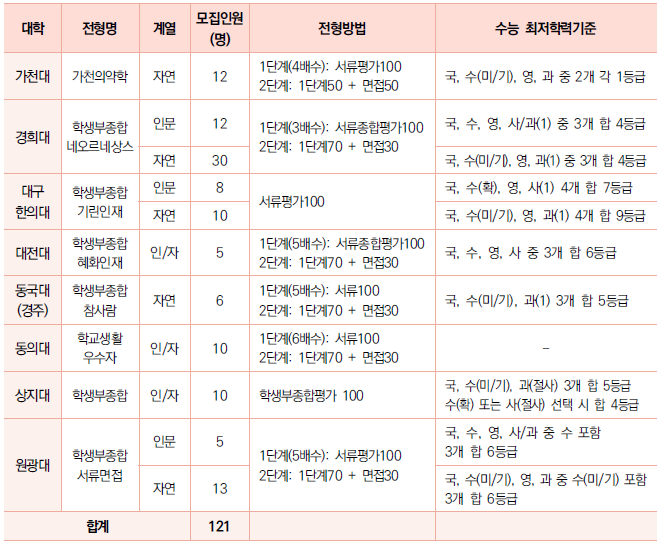 □ 한의예과 수시 고른기회 전형 전형방법 및 수능 최저학력기준