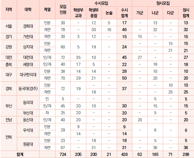 □ 한의예과 수시/정시 대학별/전형별 모집인원 현황