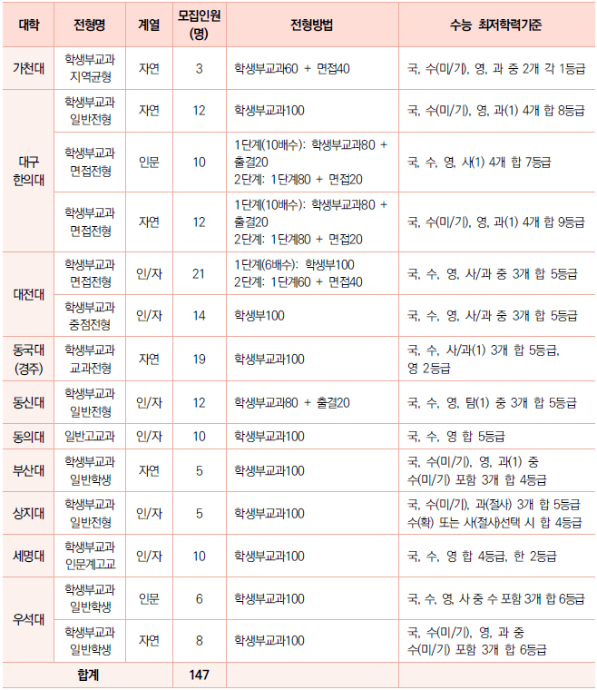 □ 한의예과 수시 학생부교과전형 전형방법 및 수능 최저학력기준(최저등급)