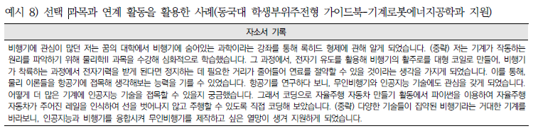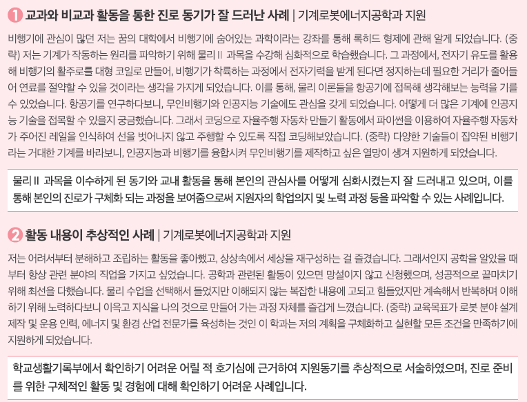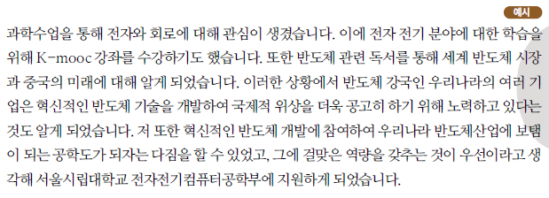 ② 교과내용과 연계된 프로젝트, 교내 경시대회, 다양한 창의적 체험활동, 독서 활동 등을 통한 모집단의에 대한 관심과 이어지게 된 계기.