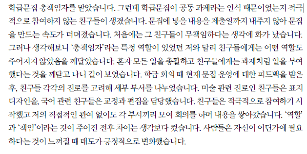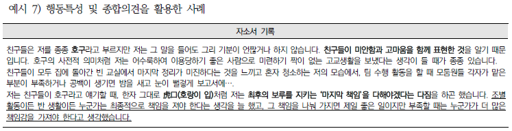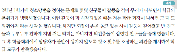 ④ 학급이나 학교, 동아리, 학습부장, 급식 당번 등 크고 작은 역할이라도 솔선수범한 내용과 자기만의 가치관을 연결하여 서술한다.